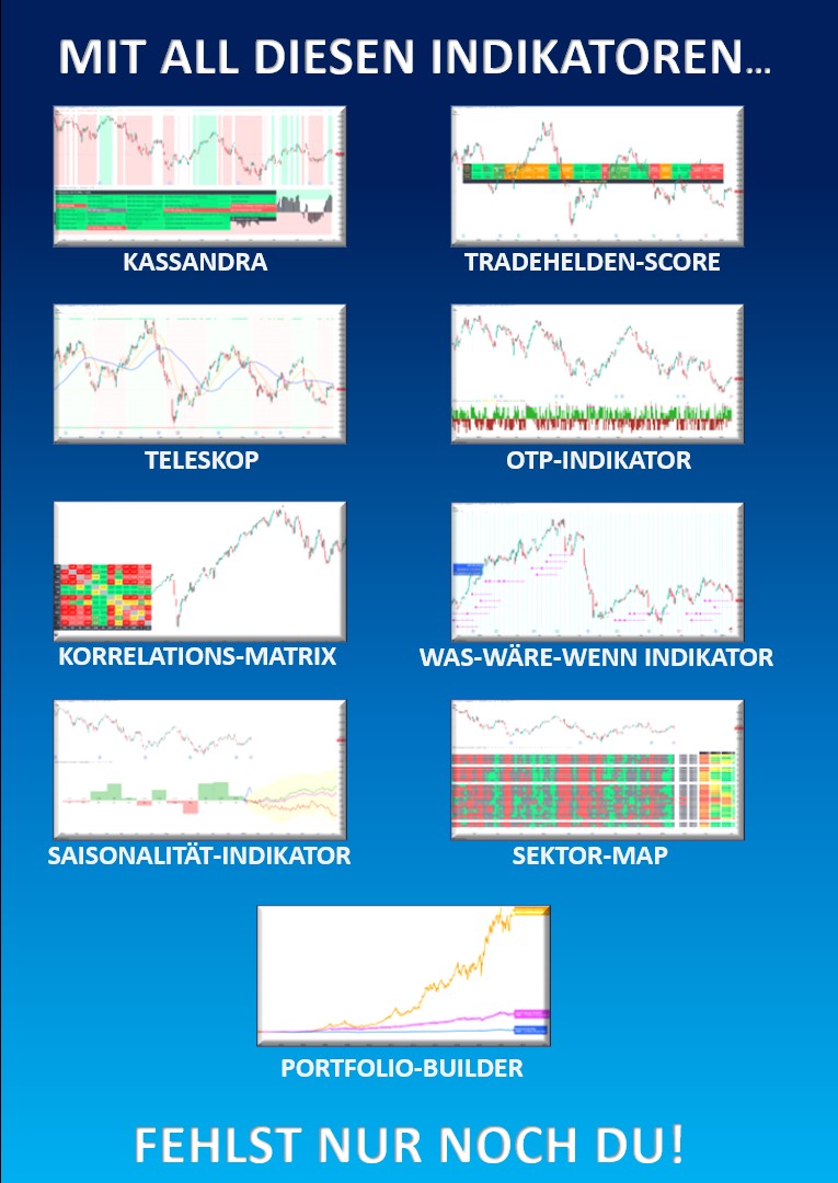 Um im schnelllebigen Umfeld der Börse langfristig zu „überleben“, anstatt hilflos im sprichwörtlichen „Haifischbecken“ unterzugehen, brauchen Sie nicht nur fundierte, aussagekräftige und somit machtvolle Werkzeuge, sondern eine individuell auf Ihre Bedürfnisse zugeschnittene „Toolbox“ an Indikatoren, die sich optimal ergänzen UND höchste Praktikabilität in der Umsetzung bieten.